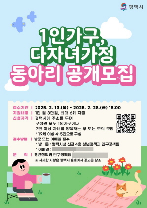 (경기=NSP통신) 김병관 기자 = 경기 평택시(시장 정장선)는 1인 가구 및 다자녀가정 대상 동아리를 13일부터 오는 28일까지 모집한다.