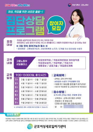 (경기=NSP통신) 정희순 기자 = 경기 군포시(시장 하은호)군포여성새로일하기센터 에서는 취업을 희망하는 여성들을 대상으로 맞춤형 집단상담프로그램인 ‘고용노동부 새일플러스’ 과정 참여자를 모집한다.