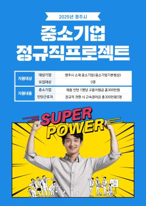 (경북=NSP통신) 김오현 기자 = 영주시(시장 박남서)는 관내 중소기업 인력난 해소와 미취업 청년, 결혼이민자 등 취업애로계층의 고용 지원을 위해 ‘2025년 중소기업 정규직 프로젝트 사업’을 추진해 오는 24일부터 3월 7일까지 참여 기업과 인턴을 모집한다.