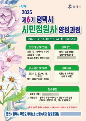 (경기=NSP통신) 김병관 기자 = 경기 평택시(정장선 시장)는 ‘제6기 평택시민정원사 양성교육(기초 이론반)’을 함께할 시민 참가자를 모집한다.