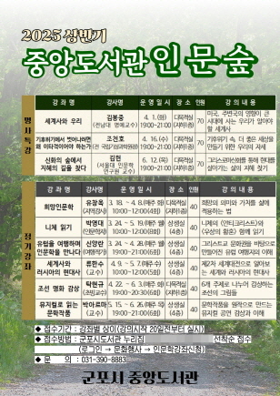 중앙도서관장은 “중앙도서관 인문숲이 군포시를 대표하는 인문학 프로그램으로 자리매김해 시민들이 인문학을 통해 서로를 깊이 이해하여 삶의 지혜를 얻게 되길 바란다”라고 말했다.
