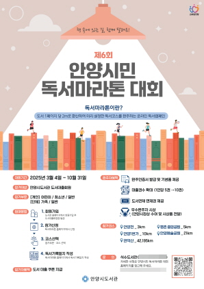 이번 대회 참가 신청은 안양시도서관 독서마라톤 홈페이지에서 3월 4일부터 가능하며 안양시도서관 도서 대출 회원이면 누구나 참여할 수 있다.