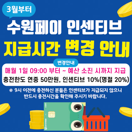 (경기=NSP통신) 조현철 기자 = 경기 수원시(시장 이재준)가 3월부터 수원페이 인센티브 지급 시작 시각을 매달 1일 오전 9시로 변경한다.
