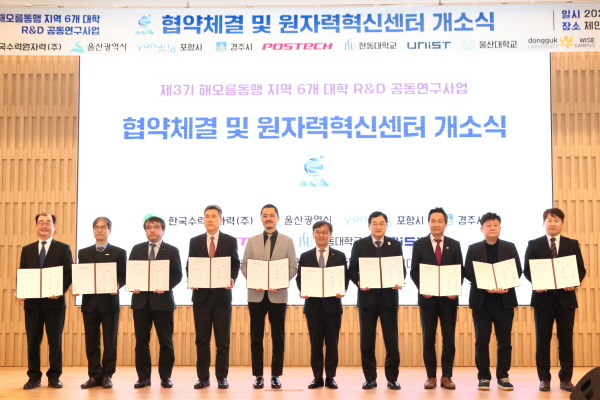 이날 개소한 원자력혁신센터는 주관대학인 포스텍 내에 설치되며 협약에 참여한 해오름 지역의 6개 거점 대학은 협력체계를 구축해 지역 산업 협력, 미래에너지기술, 인문사회융합 등 총 33개 분야의 공동 연구를 수행하게 된다.