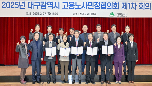 (경북=NSP통신) 김대원 기자 = 대구광역시는 27일 산격청사 대강당에서 정장수 대구광역시 경제부시장, 김인남 대구경영자총협회 회장, 윤수경 대구지방고용노동청장 등 고용·노사민정협의회 위원이 참석한 가운데 ‘2025년 고용·노사민정협의회’ 제1차 회의를 개최했다.