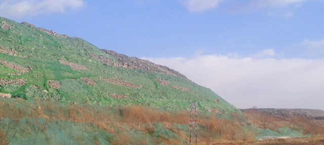해남군 화원면 양화리 도로 공사 선상에 거대 산더미 처럼 쌓여 있는 발파암석, 하단에 도로 표층 등이 표식과 비교를 보이고 있다. (사진 = 윤시현 기자)