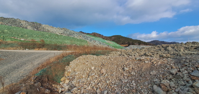 운영 침사지까지 매립된 지역 발파암석 야적장 (사진 = 윤시현 기자)
