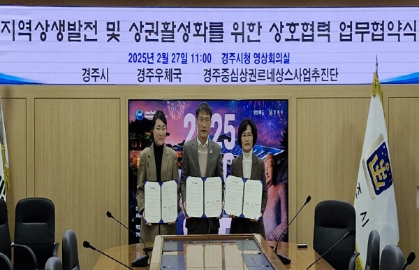 (경북=NSP통신) 김대원 기자 = 경북지방우정청 소속 경주우체국(국장 박상숙)은 지난 27일 경주시(경제산업국장 고영달)·경주중심상권르네상스사업추진단(단장 김미승)과 함께 지역 소상공인 지원과 중심상가 활성화를 위한‘지역상생발전 및 상권활성화’업무협약을 체결했다.