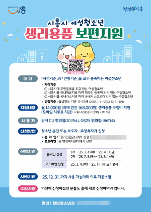 (경기=NSP통신) 서국현 기자 = 경기 시흥시(시장 임병택)가 4일부터 ‘2025년도 시흥시 여성청소년 생리용품 보편지원 사업’ 신청을 받는다.