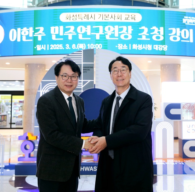 NSP통신-6일 정명근 화성시장(오른쪽)과 이한주 민주연구원장이 기념촬영을 하고 있다. (사진 = 화성시)