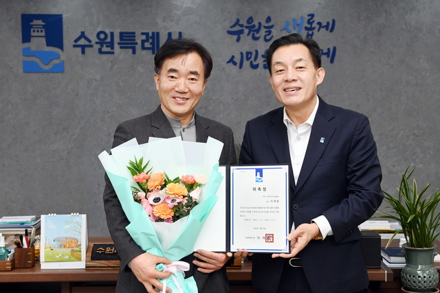 이재준 수원시장이 5일 시청 집무실에서 이재훈(65) 협회장에게 위촉장을 수여했다.