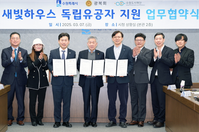 시는 7일 시청 상황실에서 광복회 수원시지회, 수원도시재단과 ‘새빛하우스 독립유공자 지원 업무협약’을 체결하고 협력을 약속했다.