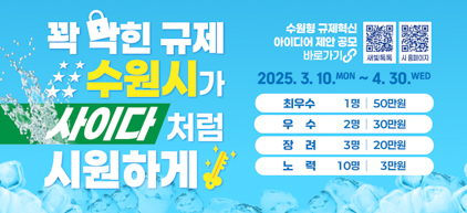 수원시 관계자는 “생활 속에 숨어있는 불합리한 규제를 개선할 수 있는 참신한 아이디어를 응모해 주시길 바란다”며 “시민이 체감할 수 있는 규제혁신을 위해 적극적으로 노력하겠다”고 말했다.