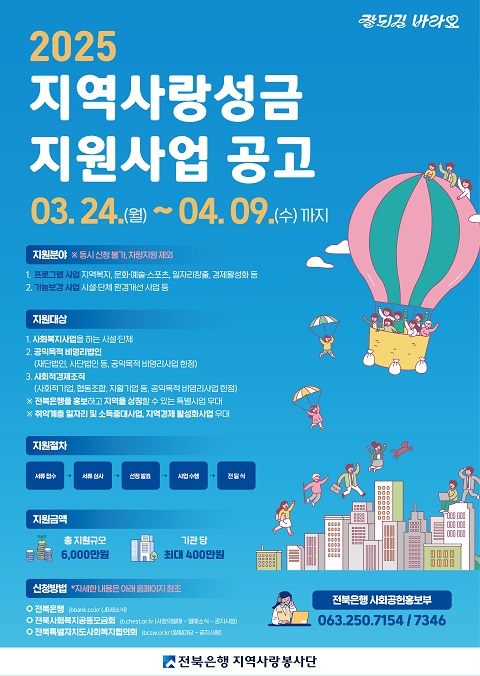 (전북=NSP통신) 김광석 기자 = JB금융그룹 전북은행지역사랑봉사단(공동단장 백종일 은행장, 정원호 노조위원장)은 직원들의 자발적 참여로 십시일반 모아 마련한 지역사랑성금을 통해 2025년 ‘지역사랑성금 지원사업’ 공모를 실시한다고 밝혔다.
