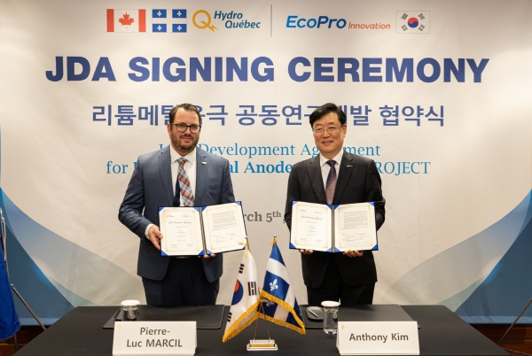 이날 협약식에는 김윤태 에코프로이노베이션 대표, 피에르 뤽 막실 하이드로퀘백 연구총책임자, 다미엥 페레라 퀘백정부 대표, 존 짐머만 캐나다대사관 대표 등 양사 주요 경영진 및 캐나다 주정부 관계자들이 참석했다.