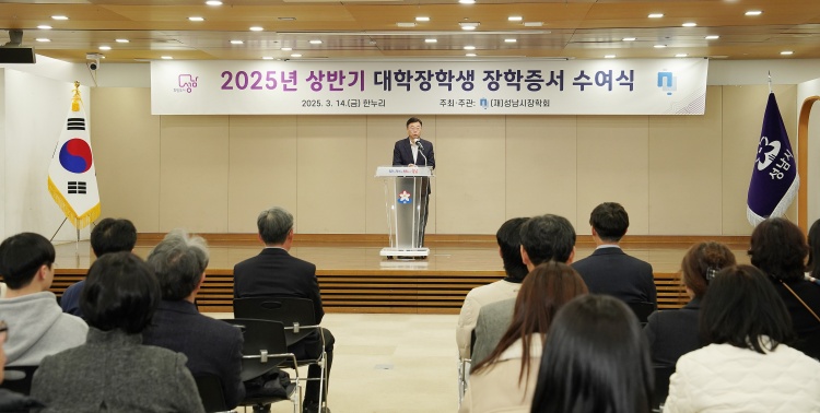 (경기=NSP통신) 김병관 기자 = 신상진 경기 성남시장은 14일 오후 성남시청 한누리에서 열린‘2025년 성남시장학회 상반기 대학생 장학증서 수여식’에 참석해 지역 인재들을 격려했다.