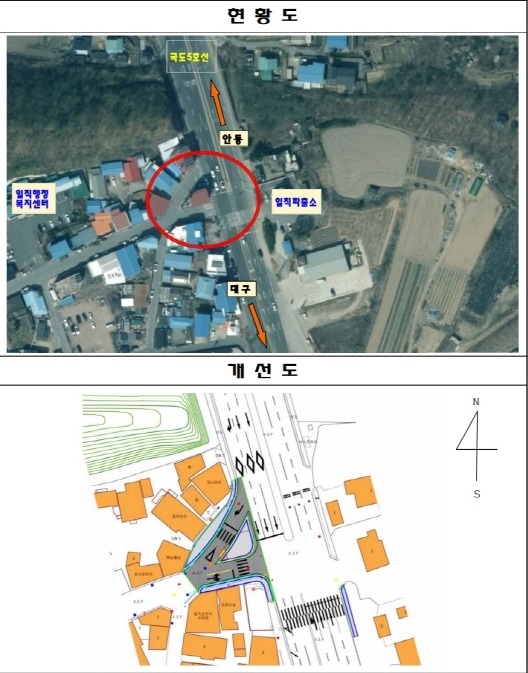 (경북=NSP통신) 김오현 기자 = 안동시는 평소 교통량이 많고 시계 불량으로 인해 위험이 큰 국도 5호선 일직면 소재지 진입 교차로를 정비한다.