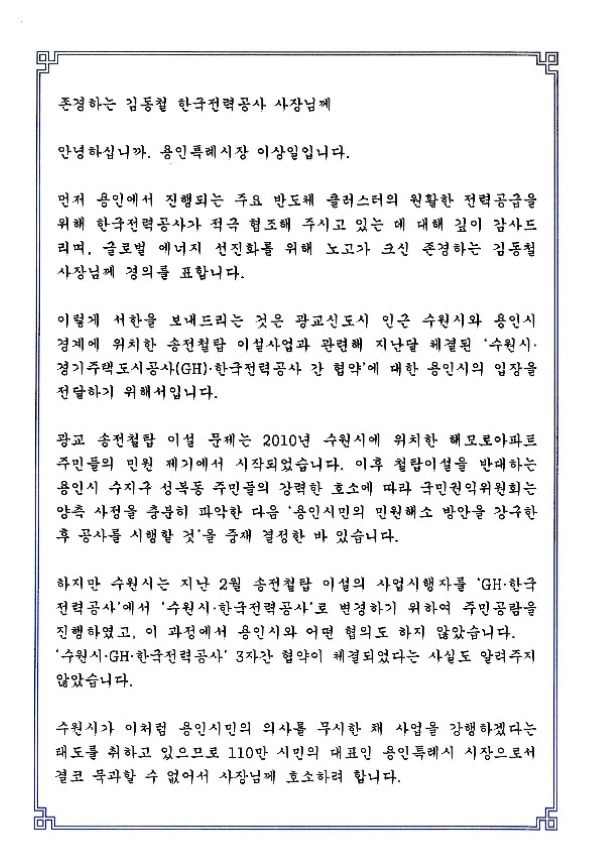이 시장은 김 사장과의 전화통화에서 서한을 보낸 이유, 서한 내용을 설명하고 용인시의 입장을 무시한 수원시의 문제를 한국전력이 깊이 검토해 달라고 요청했다.