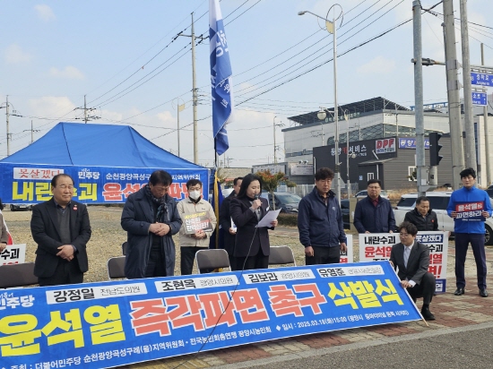 (전남=NSP통신) 김성철 기자 = 더불어민주당 이재명 대표를 비롯한 국회의원들이 거리행보에 나섰고, 일부 의원들은 삭발을 하고 단식농성에 돌입한 가운데 순천·광양·곡성·구례을 지역위원회 시·도의원들이 윤석열 대통령 즉각파면 촉구하며 삭발에 나섰다.