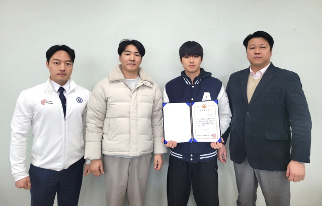 안양대 스포츠단의 검도부 장지원 선수가 검도 국가대표 상비군으로 선발됐다. 사진은 조규일 스포츠단 부단장 교수(왼쪽부터), 임종길 검도부 감독, 장지원 선수, 박성배 스포츠단 단장 교수의 기념촬영 모습. (사진 = 안양대학교)