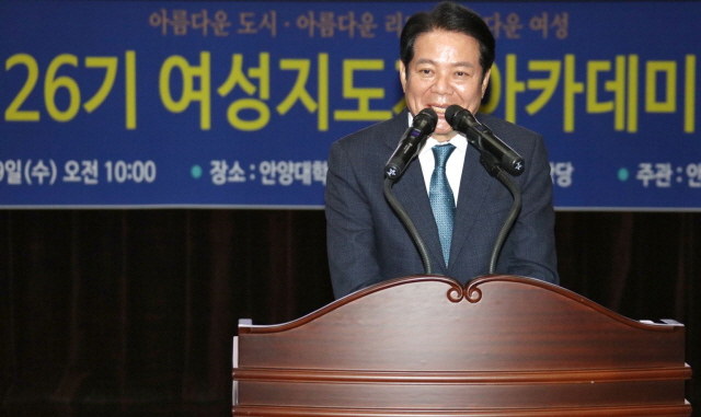 19일 오전 안양대학교 아름다운리더관 소강당에서 열린 제26기 안양시 여성지도자 아카데미 입학식에서 최대호 안양시장이 축사하는 모습. (사진 = 안양시)