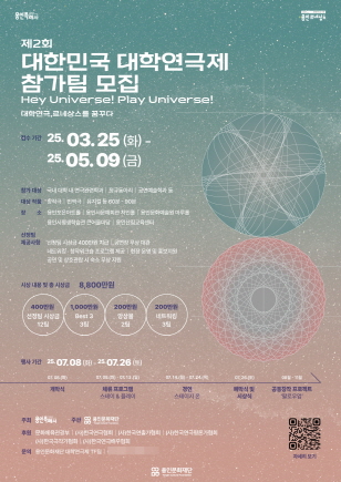 (경기=NSP통신) 김병관 기자 = 경기 용인특례시가 주최하고 용인문화재단이 주관하는 ‘제2회 대한민국 대학연극제’(대학연극제)에서 다가오는 25일부터 5월 9일까지 참가팀을 모집한다.