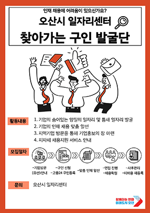 (경기=NSP통신) 조현철 기자 = 경기 오산시(시장 이권재)가 최근 경기침체로 구인처 감소 등 어려워진 채용시장의 활성화를 위해 현장 중심의 ‘찾아가는 구인 발굴단’을 확대 운영한다.