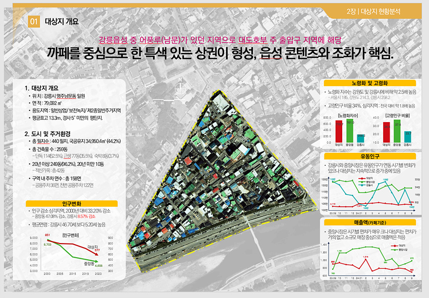 따라서 공모사업 선정을 위한 상권 기획이 아니라 쇠퇴한 강릉시 원도심 지역의 실질적인 문제 인식과 해결책을 담아 지속적으로 ‘상권활성화사업’을 추진할 수 있는 원동력이 될 것으로 보고 있다.