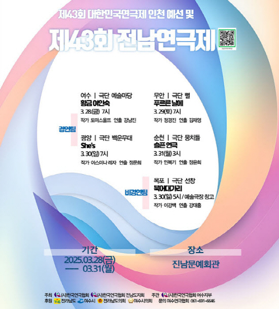 (전남=NSP통신) 서순곤 기자 = 여수시는 오는 28일부터 31일까지 4일간 진남문예회관에서 제43회 전남연극제가 개최된다고 밝혔다.