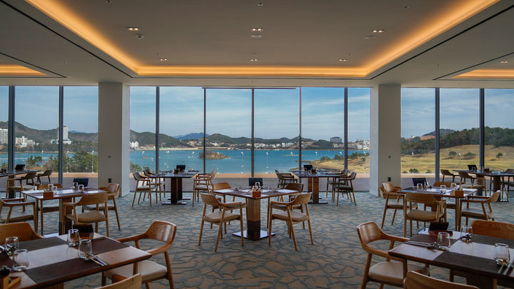 레스토랑은 바다를 파노라마처럼 감상할 수 있는 오션뷰 공간으로 새롭게 태어났다. 바다를 닮은 곡선 디자인과 자연스러운 흐름을 반영한 인테리어는 세이지우드가 추구하는 완벽한 휴식의 공간을 실현하며 넓은 통유리창을 통해 여수 앞바다의 탁 트인 전망을 감상할 수 있다.