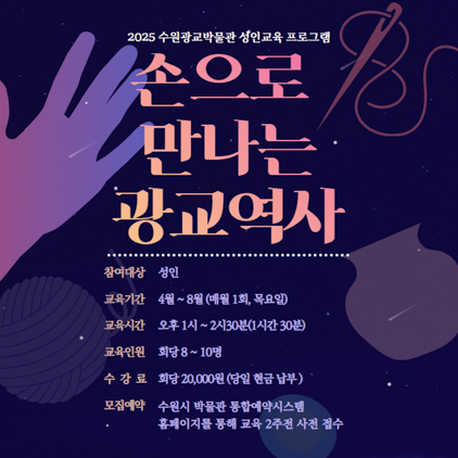 수원광교박물관 관계자는 “‘손으로 만나는 광교역사’는 전통적 주제를 현대적으로 재해석하고 지역 공방과의 협업으로 창작의 가치를 재발견하는 프로그램”이라며 “많은 분이 함께해 새로운 문화를 체험하는 즐거움을 얻길 바란다”고 말했다.