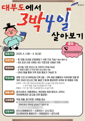 (경기=NSP통신) 김병관 기자 = 경기 안산시(시장 이민근)는 내달 1일부터 18일까지 ‘대부도에서 3박 4일 살아보기’ 프로그램 참여자를 모집한다.