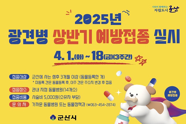 (전북=NSP통신) 김광석 기자 = 전북자치도 군산시가 시민과 반려동물의 건강·안전을 위해 2025년 상반기 광견병 예방접종을 실시한다.