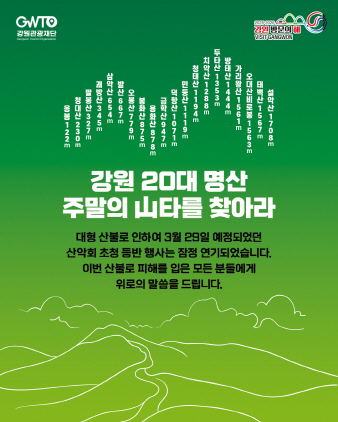 (강원=NSP통신) 조이호 기자 = 강원특별자치도(도지사 김진태) 강원관광재단(대표 최성현)은 전국 곳곳에서 발생한 대형 산불의 심각성을 고려해 오는 29일 춘천 삼악산에서 진행 예정이던 강원 20대 명산 등반 캠페인 행사를 잠정 연기한다.
