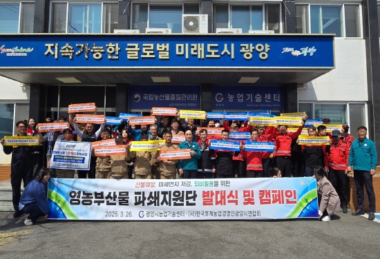 (전남=NSP통신) 김성철 기자 = 광양시는 지난 26일 농업기술센터에서 (한국후계농업경영인회원 및 산불진화대 등 60여 명이 참석한 가운데 영농부산물 무료 파쇄 지원사업을 본격 운영하기 위한 ‘찾아가는 영농부산물 파쇄지원단’ 안전교육 실시 후 발대식 및 캠페인을 가졌다고 밝혔다.