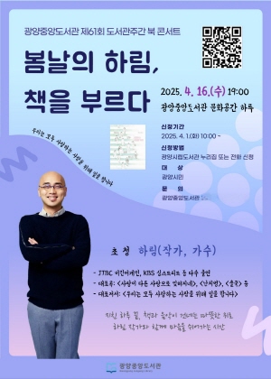 (전남=NSP통신) 김성철 기자 = 광양중앙도서관이 제61회 도서관 주간을 맞아 오는 4월 16일 저녁 7시 광양시민을 대상으로 북 콘서트 ‘봄날의 하림, 책을 부르다’를 운영한다.