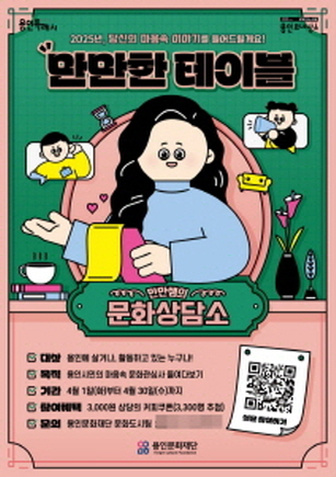 (경기=NSP통신) 김병관 기자 = 경기 용인문화재단(이사장 이상일)은 용인 시민의 문화 관심사 파악을 위해 시민 의견 수렴 프로젝트인 ‘2025 만만한 테이블’을 4월에 진행한다.