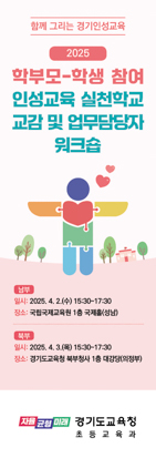 도교육청은 2일과 3일 인성교육 실천학교 118교(초 42교, 중 55교, 고 21교) 교감, 담당교사, 교육지원청 담당 장학사 등 260여 명을 대상으로 국립국제교육원(성남)과 도교육청 북부청사(의정부)에서 남북부 권역별 워크숍을 진행한다.