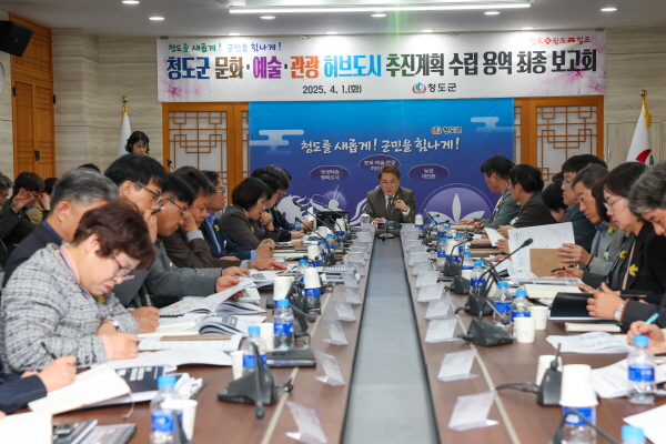(경북=NSP통신) 김대원 기자 = 청도군(군수 김하수)은 지난 1일 군청 제1회의실에서 간부 공무원, 문화·예술·관광 허브도시 조성 TF추진단, 인문사회연구소 관계자 등 60여 명이 참석한 가운데 ‘청도군 문화·예술·관광 허브도시 추진계획 수립 연구용역 최종보고회’를 개최했다.