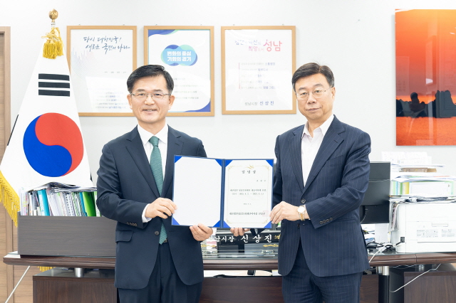 NSP통신-신상진 성남시장(오른쪽)이 2일 오전 성남아트센터 컨퍼런스홀에서 열린 재단 신임 대표 취임식에서 윤정국 대표에게 임용장 수여 후 함께 기념촬영을 하고 있다. (사진 = 성남문화재단)