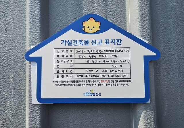 (경기=NSP통신) 조현철 기자 = 경기 화성시(시장 정명근)가 동부지역 시민들의 재산권을 보호하고 위반건축물 발생을 예방하기 위해 ‘가설건축물 존치기간 만료 사전 안내문’을 발송한다.