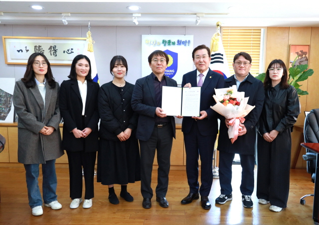 안양대 장광수 총장(오른쪽 세 번째)과 안종욱 연구단장(왼쪽 네 번째), 안양대 스마트도시공간연구소 연구원들이 사업 선정 보고 후 기념사진을 촬영하고 있다. (사진 = 안양대학교)
