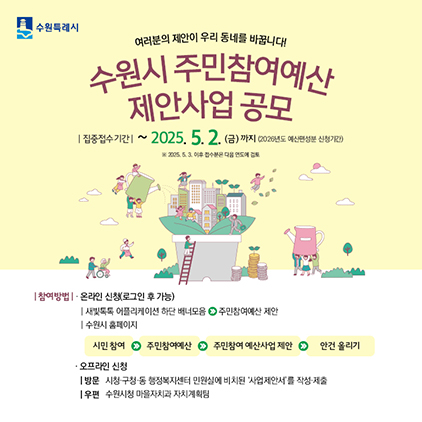 (경기=NSP통신) 조현철 기자 = 경기 수원시(시장 이재준)가 5월 2일까지 ‘2026년도 예산 편성을 위한 주민참여예산 제안사업’을 공모한다.