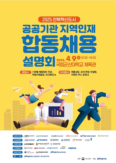 (전북=NSP통신) 김광석 기자 = 2025년 전북혁신도시 공공기관 지역인재 합동채용설명회가 오는 9일 국립군산대학교 체육관에서 개최된다.