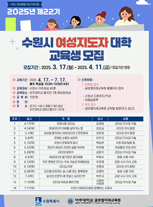 제22기 여성지도자대학은 오는 17일부터 7월 17일까지 14주 동안 매주 목요일 오전 10시부터 3시간 동안 아주대학교 율곡관 영상회의실에서 진행된다.