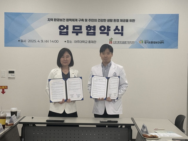 (경기=NSP통신) 조현철 기자 = 경기 수원시 환경성질환아토피센터와 경기도 환경보건센터가 9일 아주대학교 홍재관에서 ‘지역 환경보건 협력체계 구축 및 주민의 건강한 생활환경 제공을 위한 업무협약’을 체결했다.