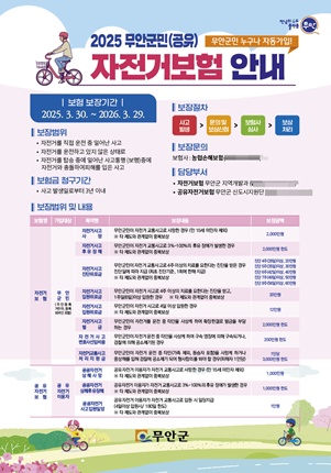 자전거 보험은 무안군에 주민등록을 둔 군민은 누구나 별도의 가입 절차 없이 자동으로 가입되며, 전국 어디에서든 자전거 사고 발생 시 보험 혜택을 받을 수 있다.