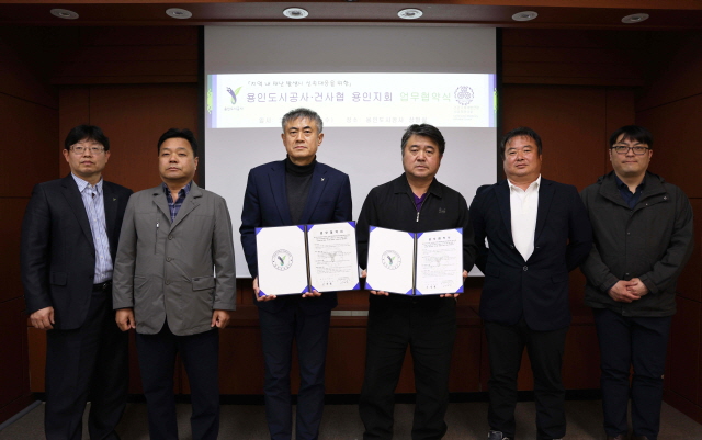 용인도시공사가 건설기계 개별연명사업자협의회 경기도 용인지회와 신속한 재난 대응 및 복구 협력 체계 구축을 위한 업무협약을 체결했다. (사진 = 용인도시공사)