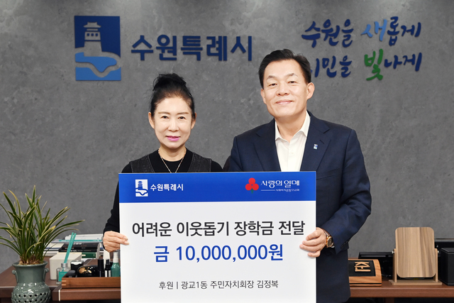 (경기=NSP통신) 조현철 기자 = 경기 수원시(시장 이재준)에 14일 김정복 영통구 광교1동 주민자치회 회장이 경제적으로 어려움을 겪는 가정의 학생을 후원하기 위해 장학금 1000만원을 기부했다.