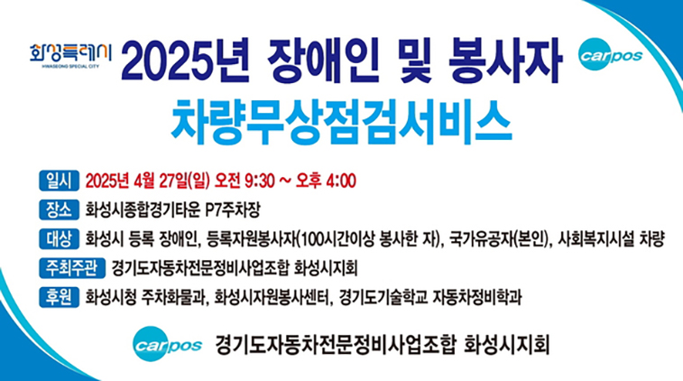 (경기=NSP통신) 조현철 기자 = 경기 화성시(시장 정명근)가 오는 27일 화성종합경기타운(화성시 향남읍 도이리) P7주차장에서 ‘2025년 사회적약자 자동차 무상안전점검 행사(서남부권)’를 개최한다.